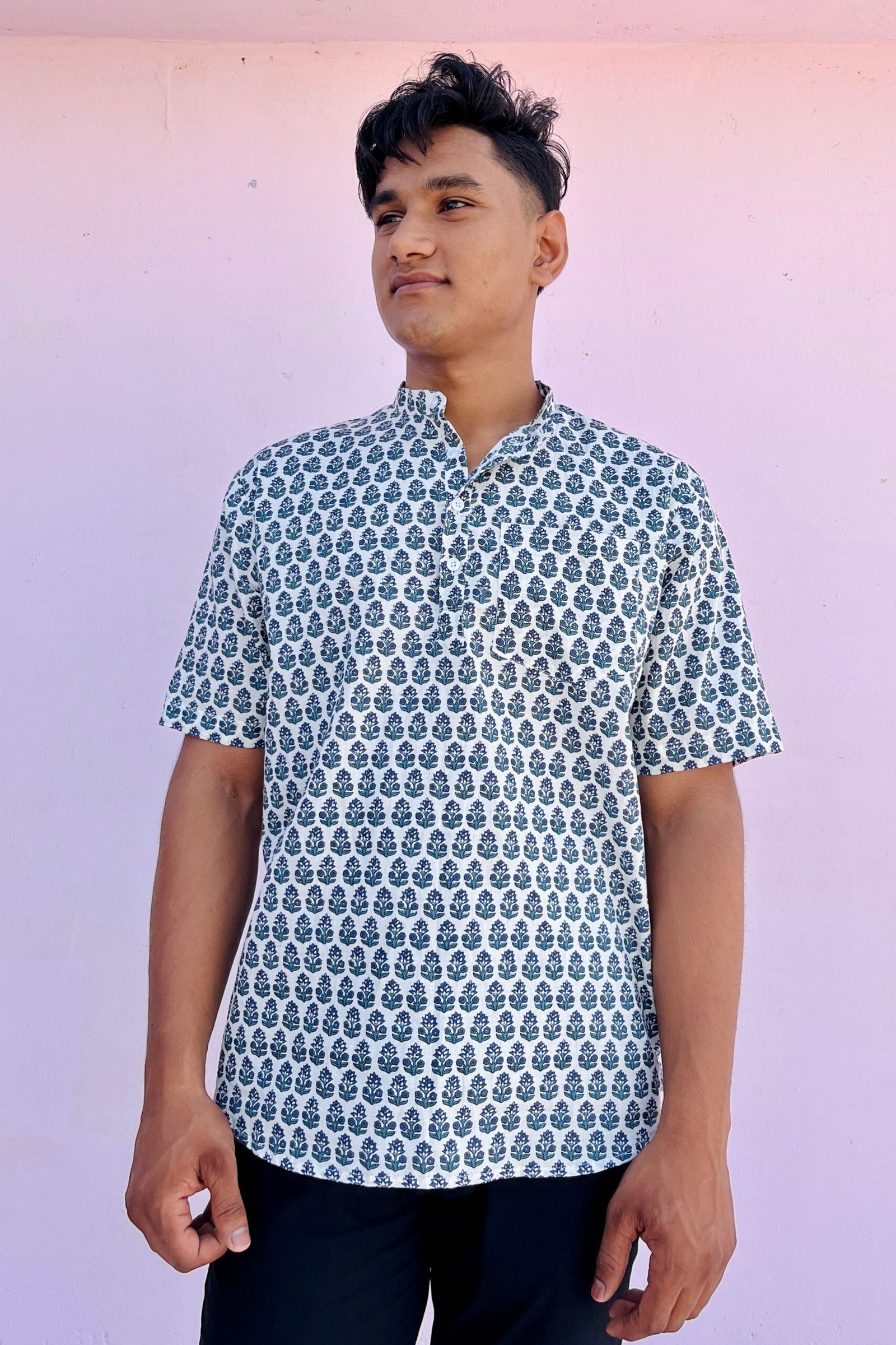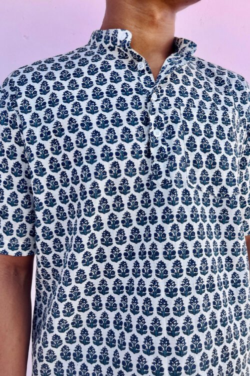 The shirt features an indigo-inspired floral block pattern set against a light base, creating a refined yet relaxed look. Its mandarin collar, short sleeves, and button-down design make it a versatile wardrobe staple that transitions effortlessly from daywear to evening gatherings.