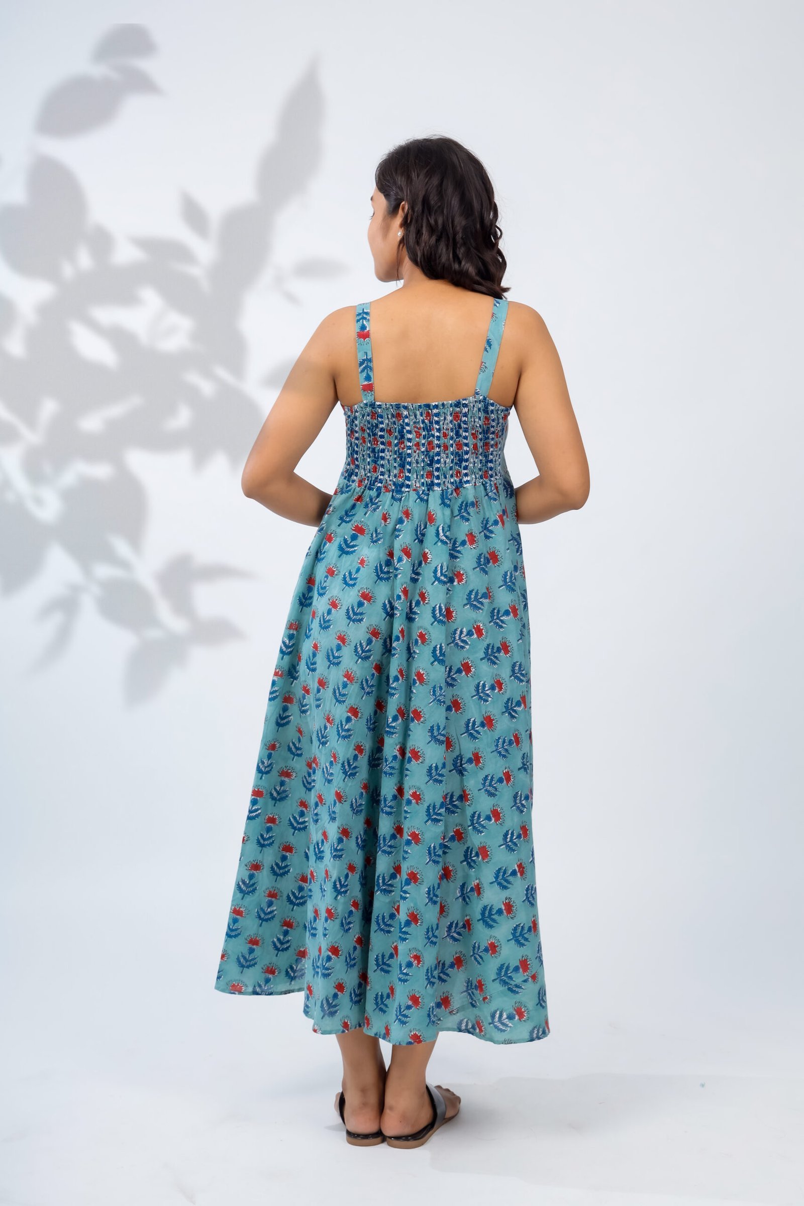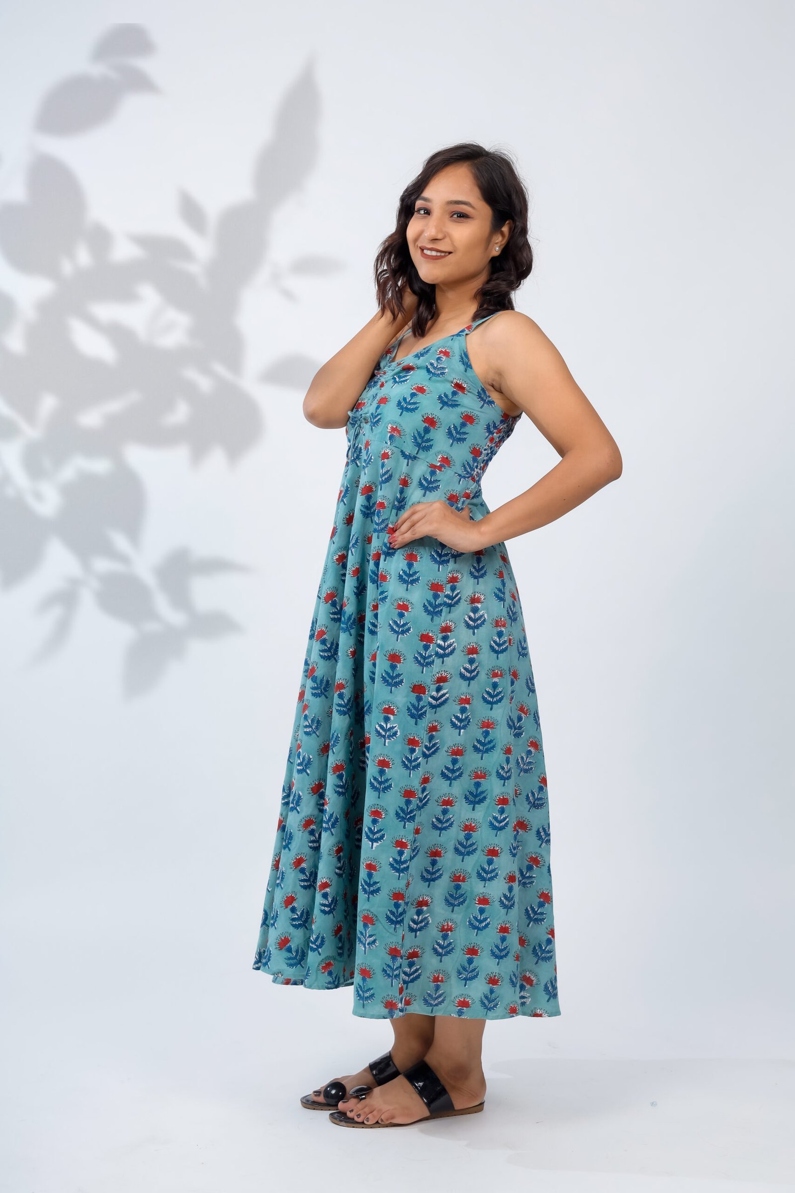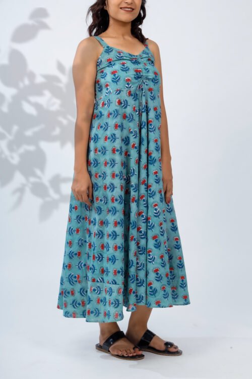 Dive into breezy elegance with the Sea of Carnation Daydress, a beautiful blend of comfort, tradition, and modern femininity. Crafted from 100% pure cotton, this sleeveless day dress features delicate hand block prints inspired by blooming carnations over a soothing aqua base — perfect for sunny days and relaxed outings.