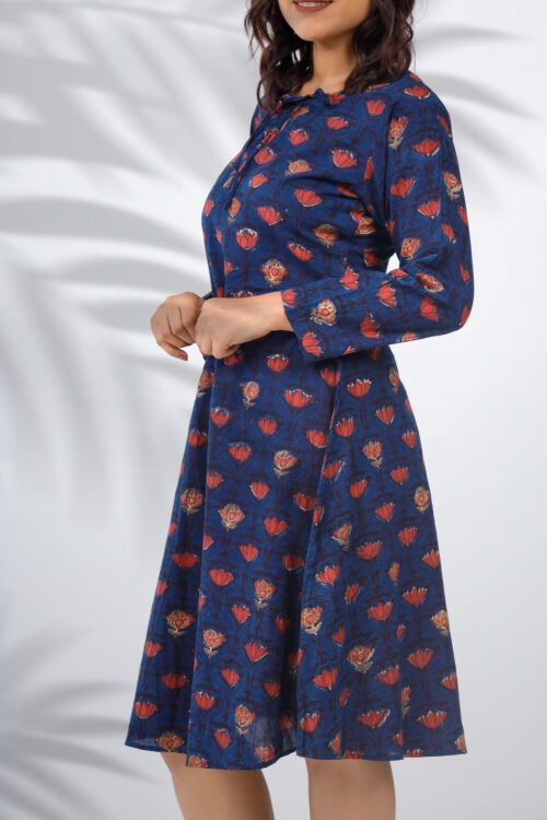 Bring timeless charm and everyday elegance to your wardrobe with the Mughal Garden Bowtie Mini Dress. Handcrafted in India from 100% pure cotton, this beautiful piece showcases intricate hand block printing inspired by Mughal floral motifs and garden aesthetics. The deep indigo base adorned with rich red prints gives it a royal yet effortlessly wearable look.