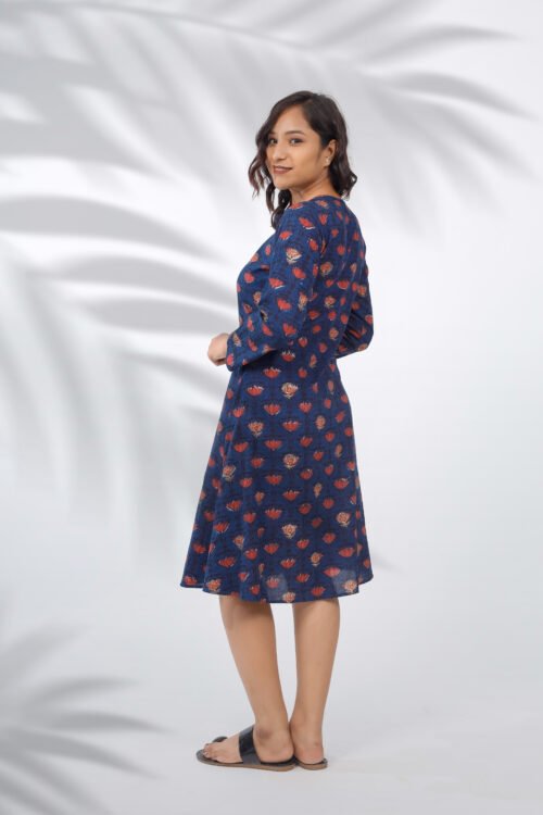 Designed with a relaxed silhouette, full sleeves, and a delicate bow tie neckline, this dress embodies comfort and sophistication. Its breathable cotton fabric and flowy fit make it the perfect outfit for day outings, brunches, or casual evenings. Each dress is crafted by skilled artisans using traditional Bagru block printing techniques, making every piece truly unique.