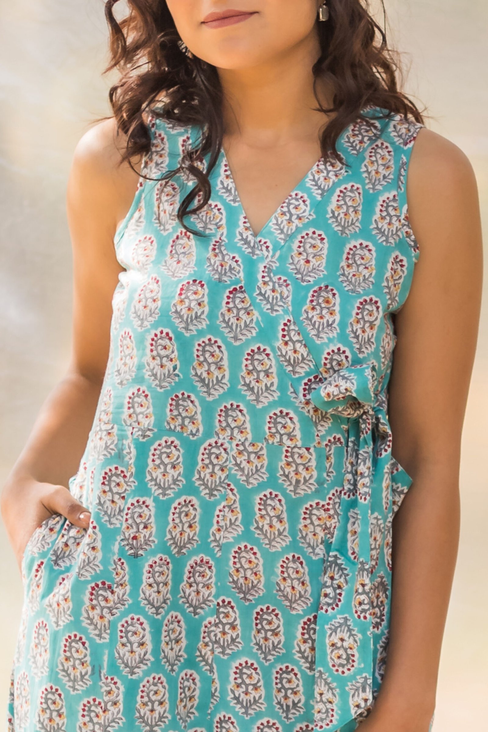 Step into effortless sophistication with the Indian Daffodil Jumpsuit, a breezy, handcrafted piece from The Royal Gardens Collection. Made from 100% soft, breathable cotton, this jumpsuit celebrates traditional hand block printing — featuring intricate daffodil-inspired floral motifs in refreshing hues of aqua and coral.