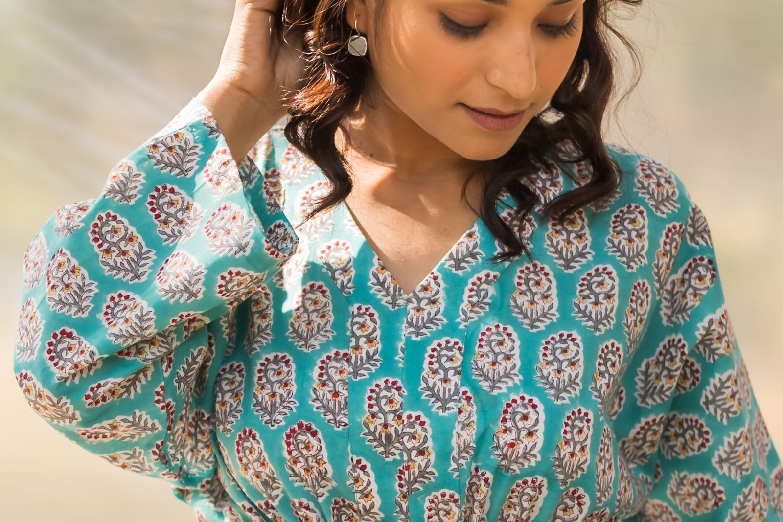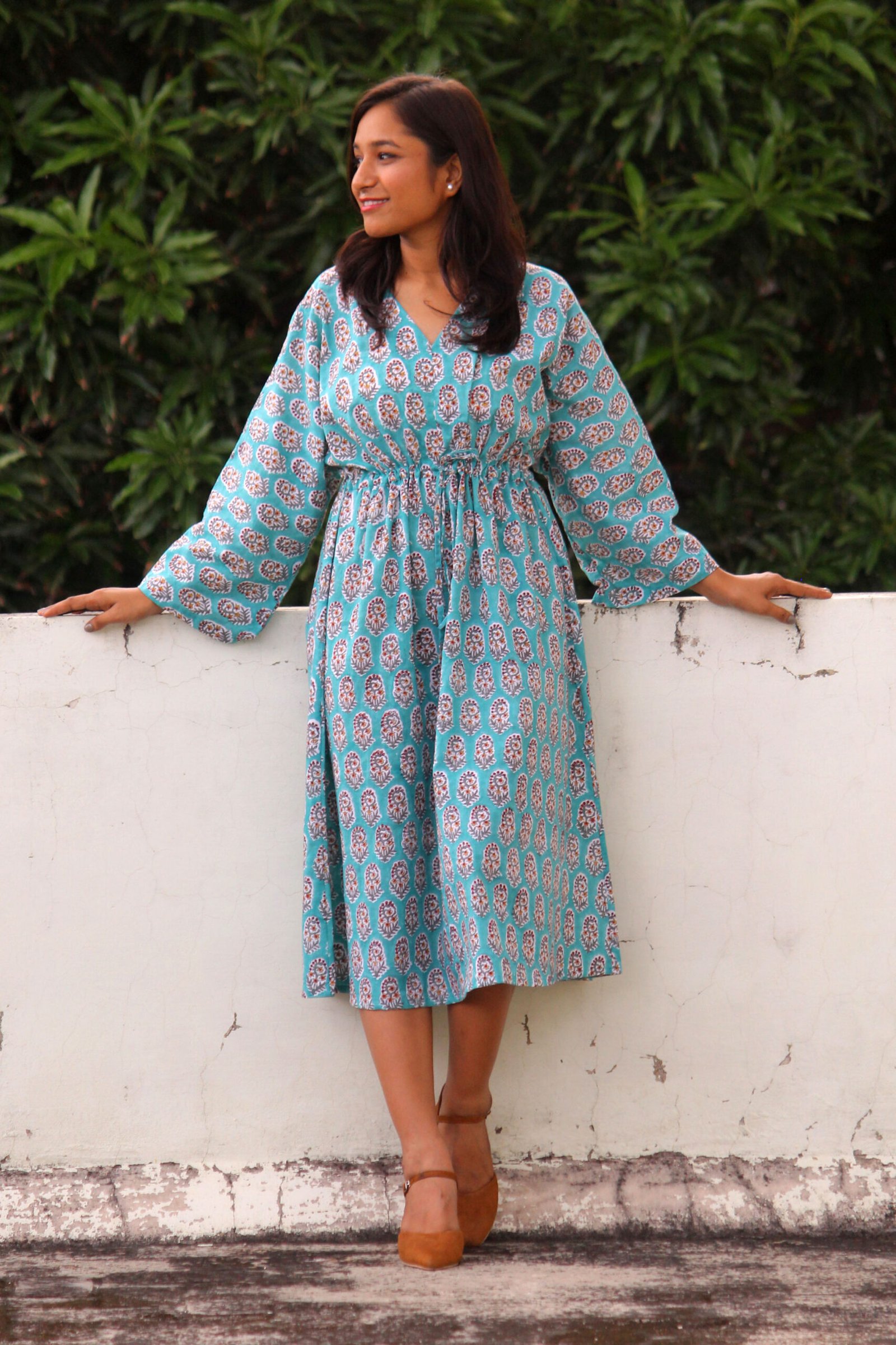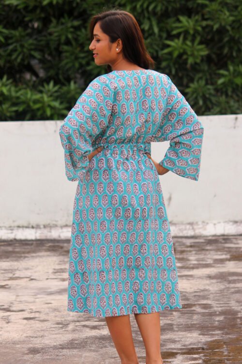 Each piece is ethically handmade in India, using eco-friendly dyes and age-old hand block printing techniques passed down through generations. Lightweight, breathable, and stylish, the Indian Daffodil Kaftaan Dress is a celebration of artisanal craftsmanship and sustainable fashion.