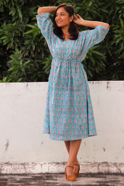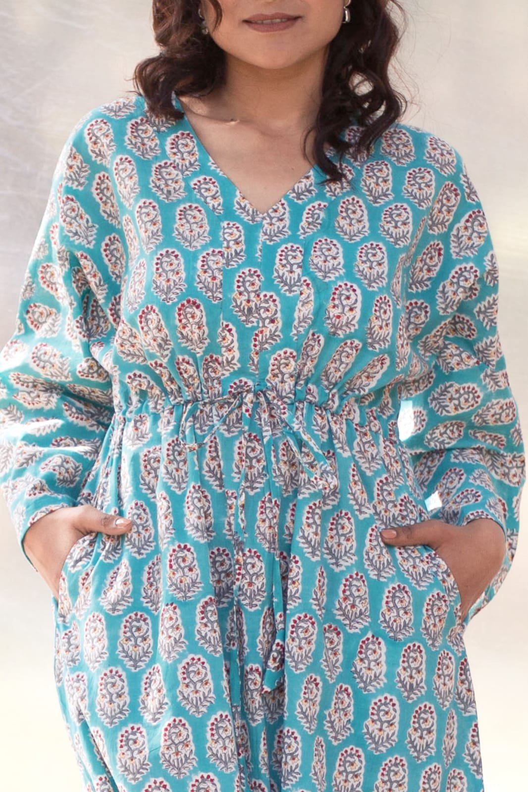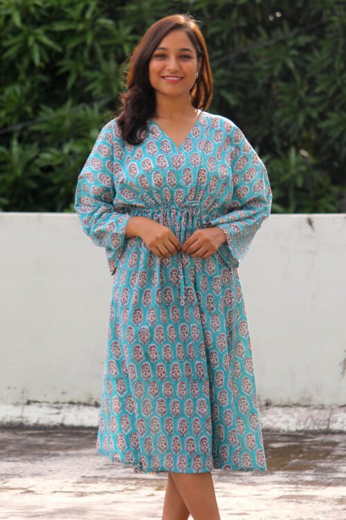 The Indian Daffodil Kaftaan Dress is a hand block printed cotton kaftan that combines comfort and style. With its adjustable drawstring waist, soft cotton fabric, and delicate daffodil motifs, it’s perfect for everyday elegance and easy summer wear.