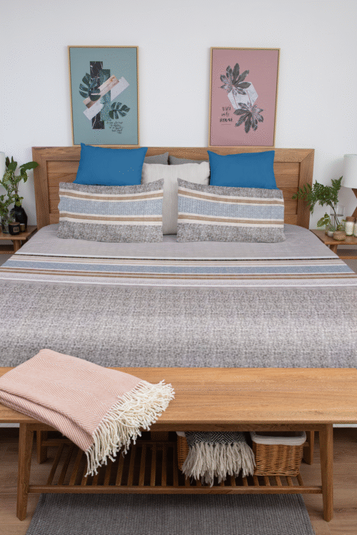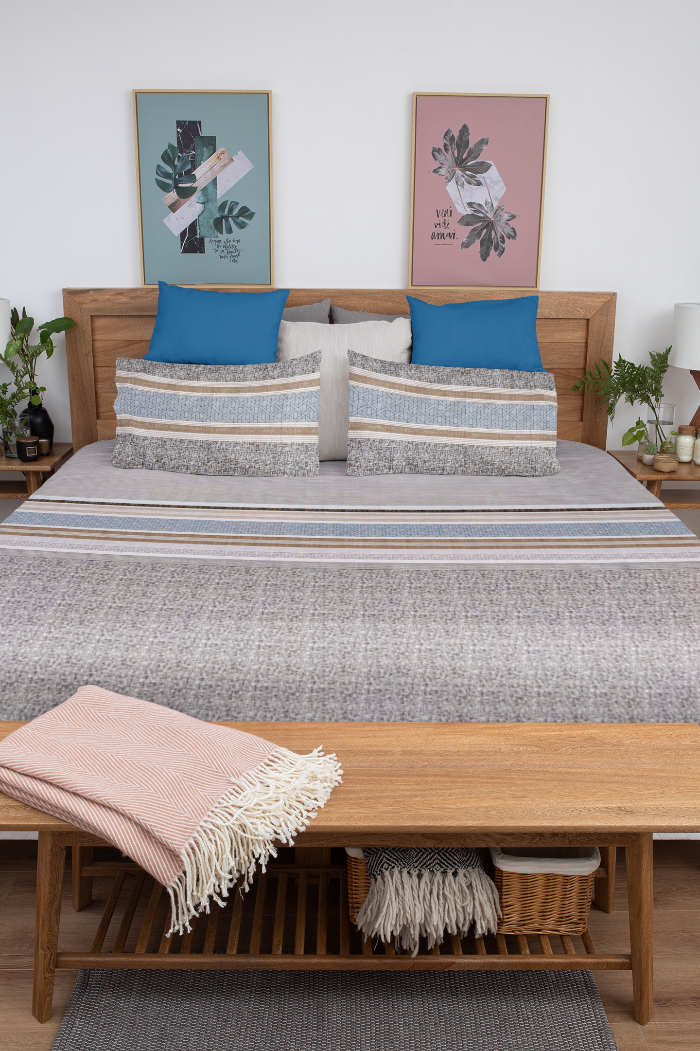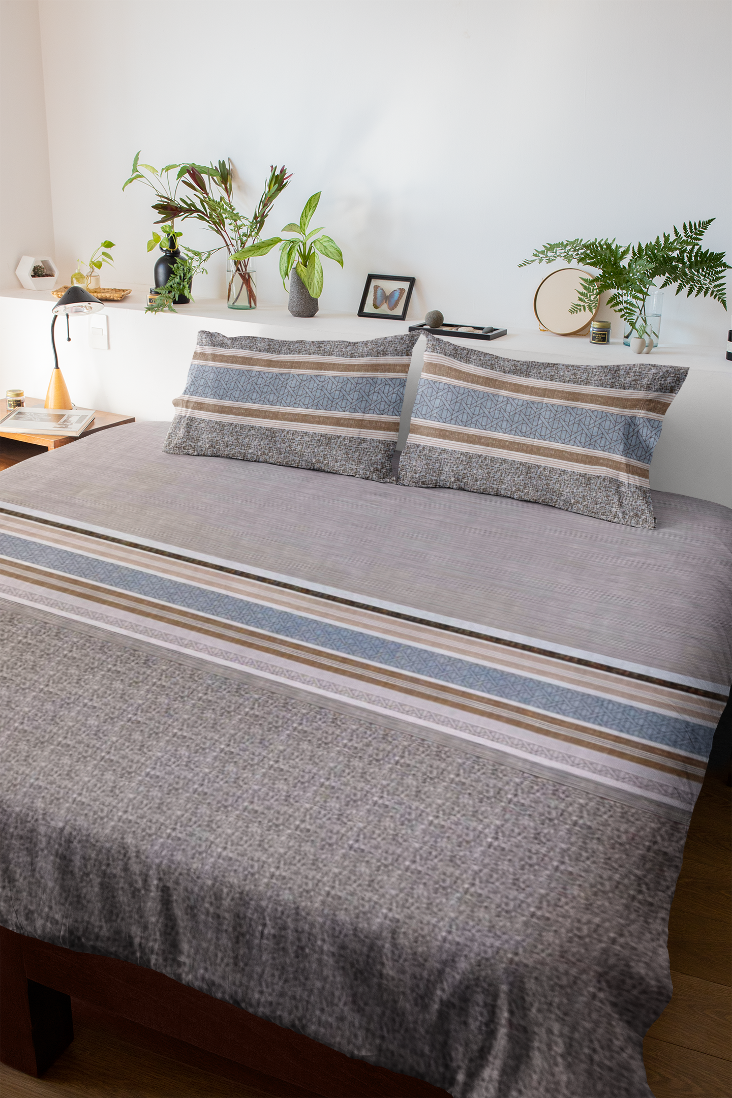 The refined striped design in earthy grey, beige, and blue tones brings a contemporary touch to your space while maintaining the timeless charm of traditional Jaipuri printing techniques. Each bedsheet is screen printed by skilled artisans, reflecting the authenticity and artistry of Rajasthan’s textile heritage.