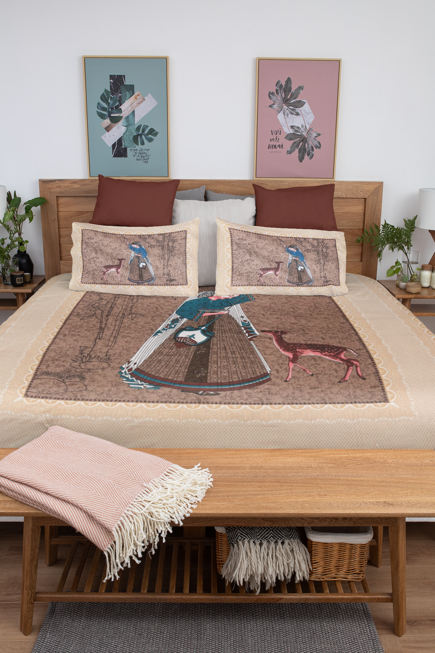 Featuring an exquisite traditional screen-printed motif of a royal figure with deer, set against rich earthy tones of brown and beige, this bedsheet adds a regal and artistic flair to your bedroom. Each design is meticulously printed by skilled artisans from Jaipur, celebrating the timeless heritage of Rajasthani textile craftsmanship.