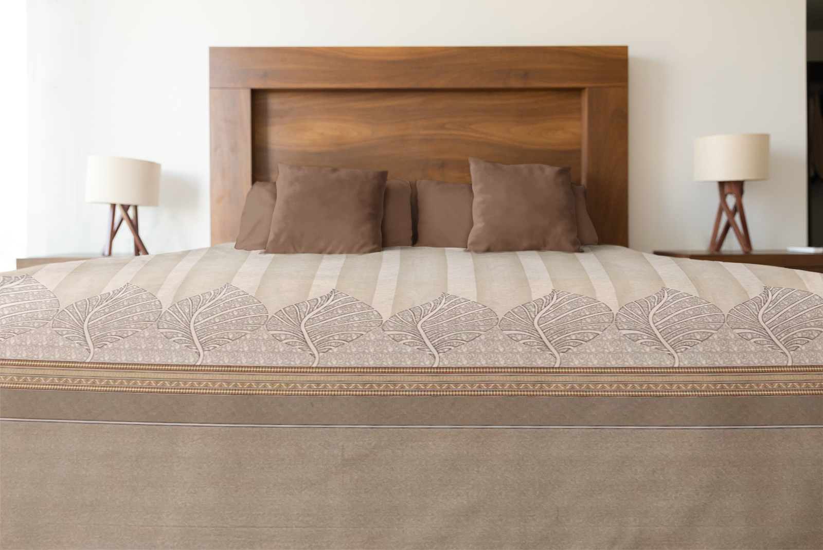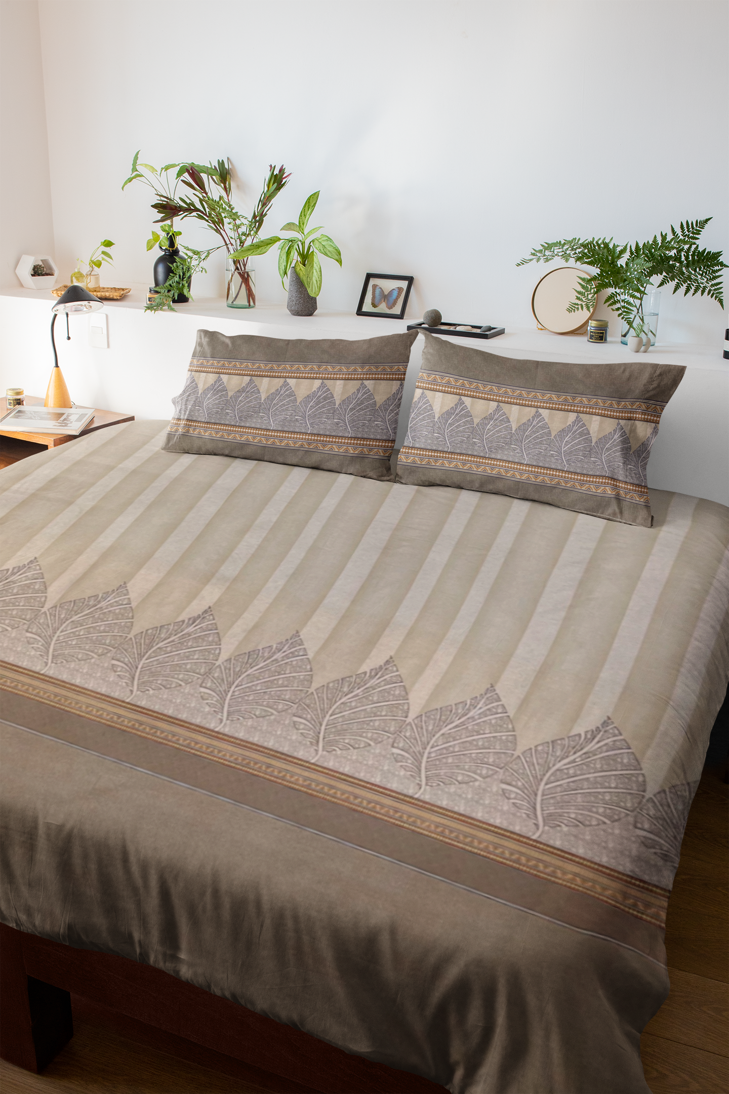 The design features a subtle floral and stripe motif in soothing shades of taupe, beige, and soft brown, exuding understated sophistication that complements any décor style. Each bedsheet is meticulously hand screen printed by skilled artisans, preserving the intricate charm of Jaipuri textile art.