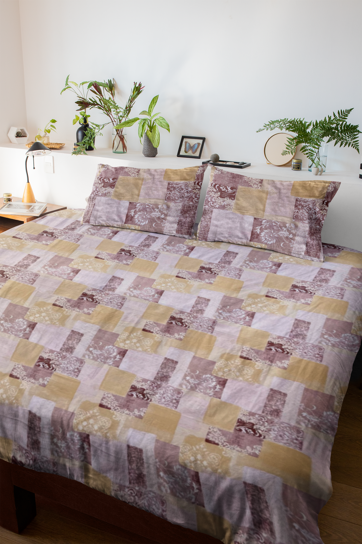 The design features a contemporary patchwork-inspired print in muted tones of lavender, beige, and cream, adding a calm and refined aesthetic to your space. Each piece is carefully hand-printed by skilled artisans, showcasing the timeless beauty and attention to detail of Rajasthani craftsmanship.