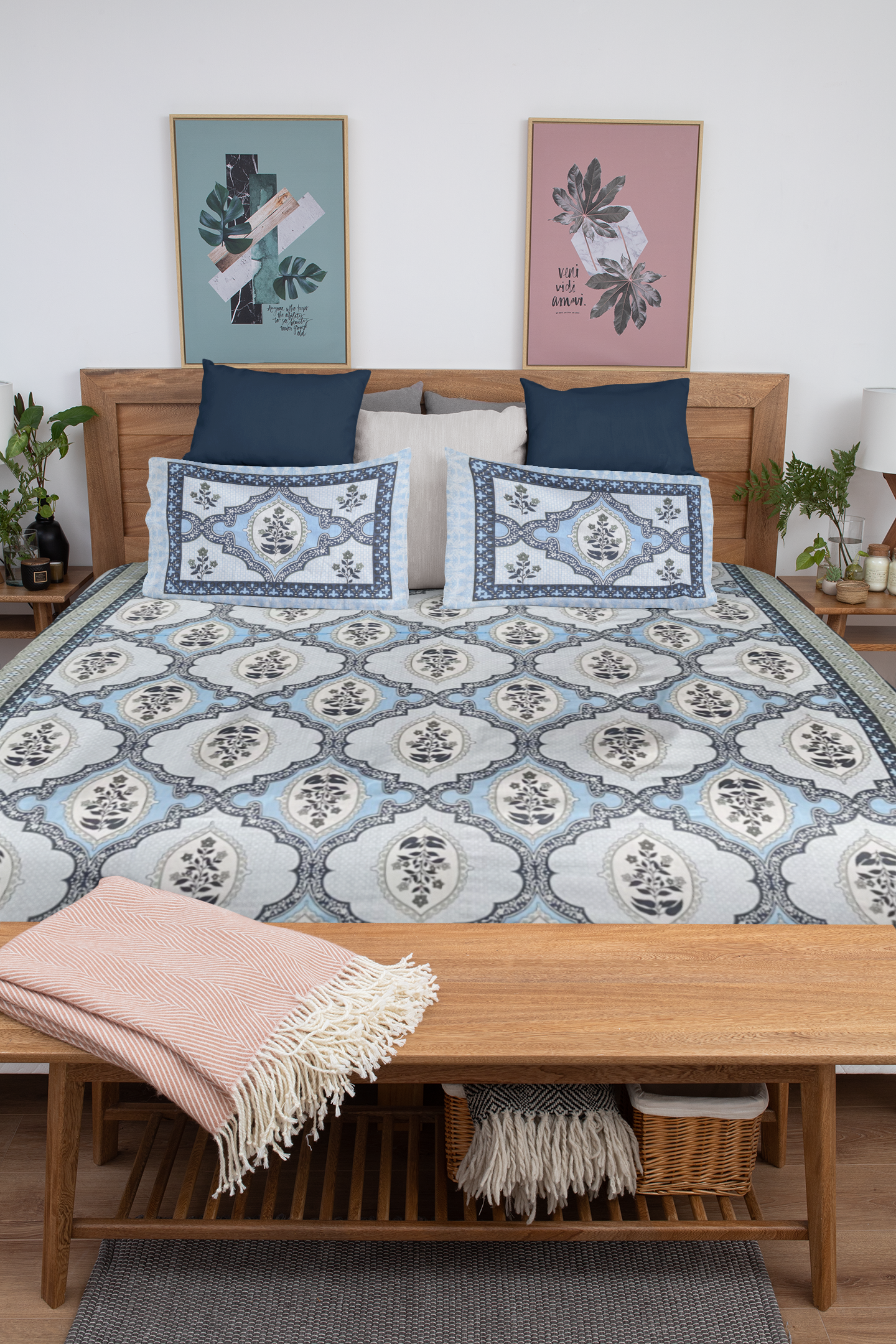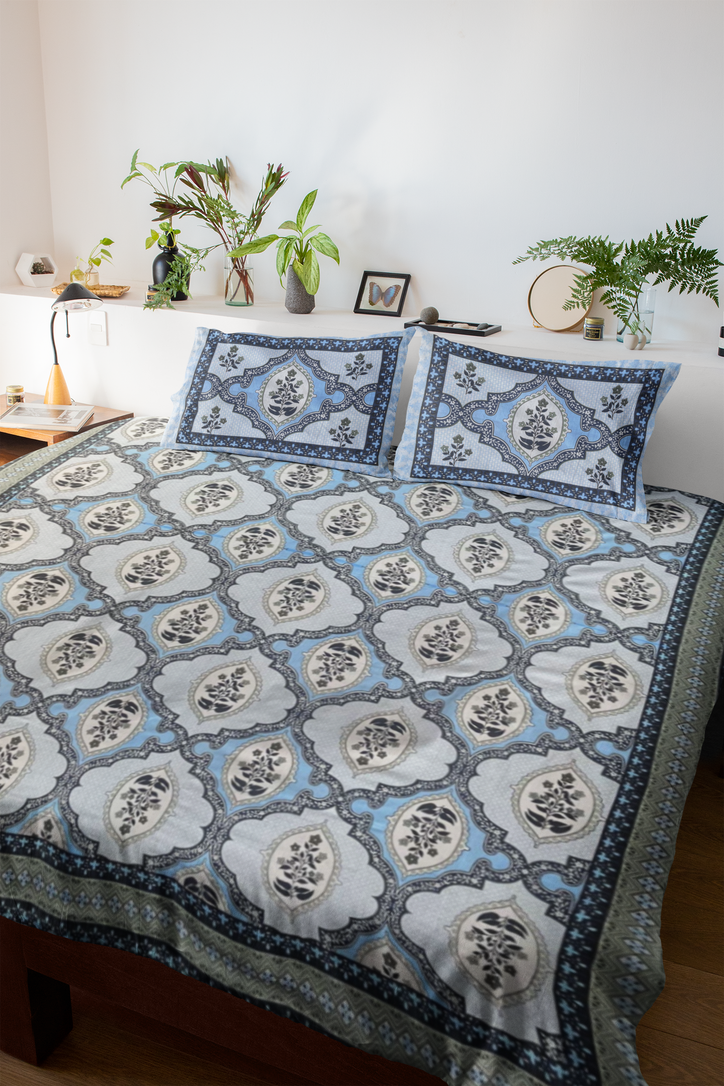 Jaipuri Cotton Screen Printed Bedsheet – Handcrafted Elegance in Soothing Blue Hues