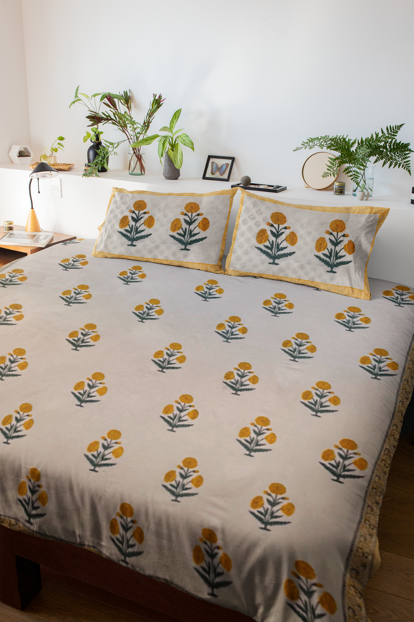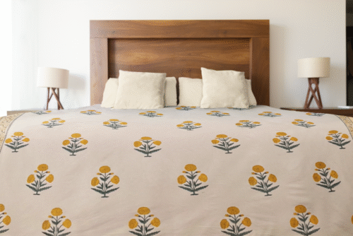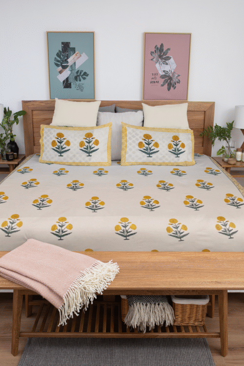 Featuring a soothing yellow floral print set against a neutral backdrop, this design brightens any space with its fresh, minimal, and earthy charm. Each bedsheet is hand block printed by skilled artisans from Jaipur, ensuring that every piece carries a unique handcrafted essence.