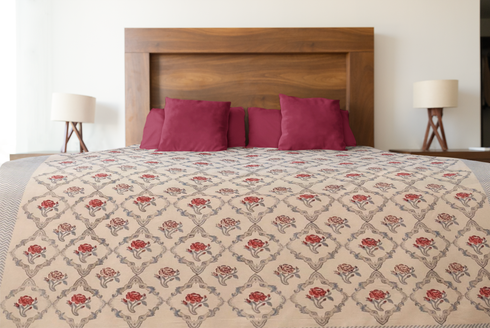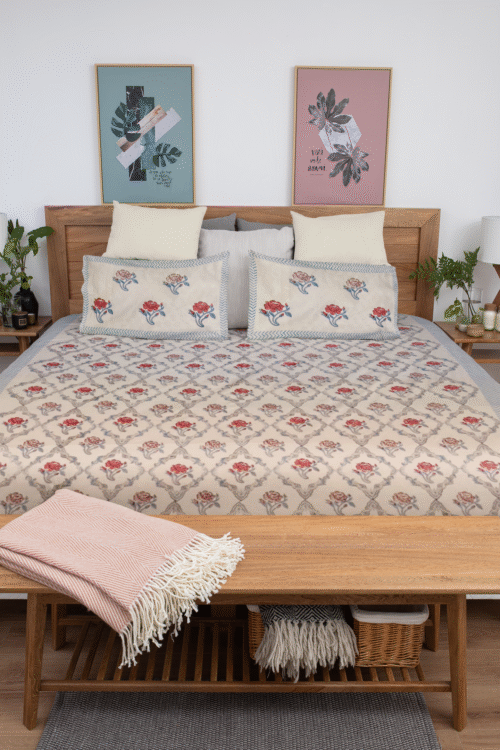 Each piece is meticulously hand block printed by skilled artisans using age-old techniques that celebrate traditional artistry. The elegant floral patterns in earthy tones bring a refreshing natural charm to your space, while the soft, lightweight cotton ensures comfort throughout the year.