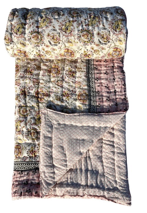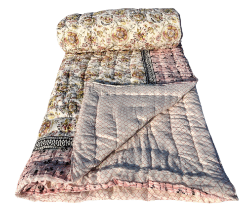 Made from 100% pure cotton, this quilt is hand-stitched using age-old Jaipuri techniques that ensure exceptional softness and durability. The reversible design features elegant floral screen prints in pastel tones, offering two complementary looks in one. Whether you want to refresh your room décor or cozy up on a cool night, this quilt brings effortless comfort and style.