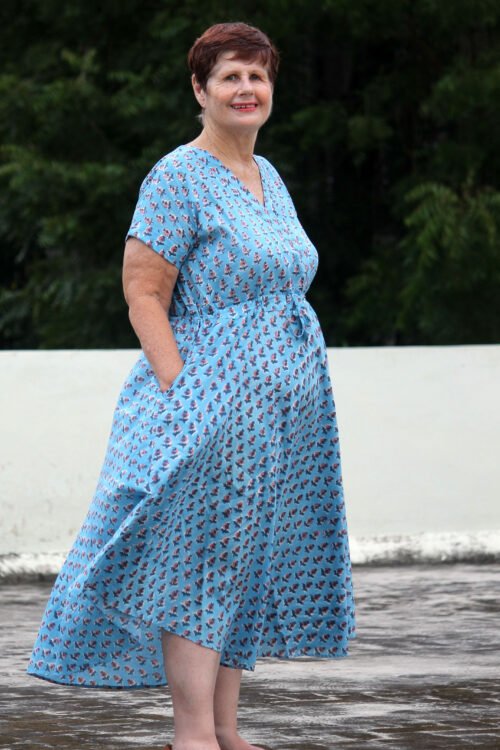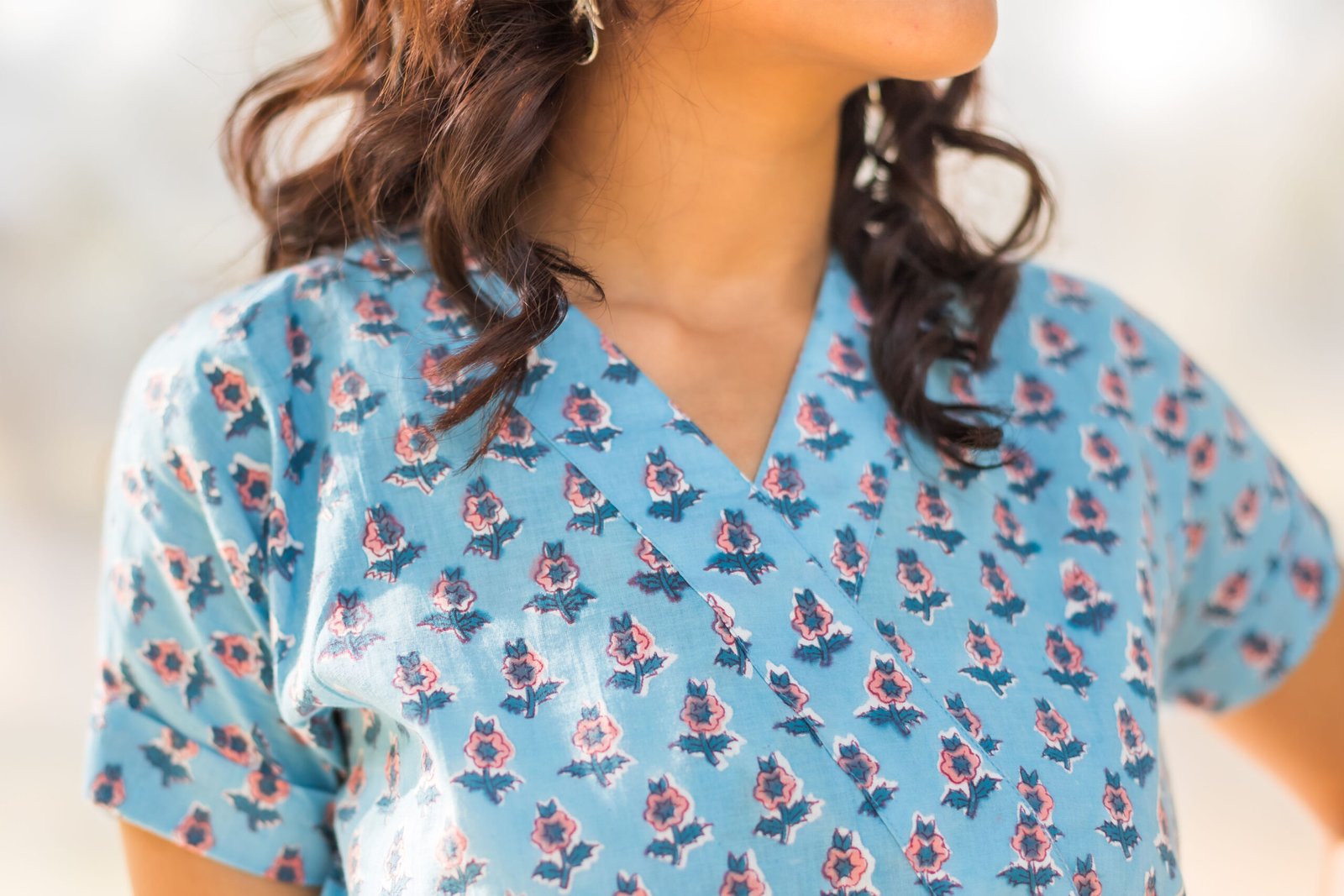 Each piece is hand block printed by skilled artisans using eco-friendly dyes and centuries-old printing techniques, making every dress unique. Whether paired with sandals for a casual day or dressed up with statement jewelry, this cotton wrap dress blends artisanal design with timeless versatility.