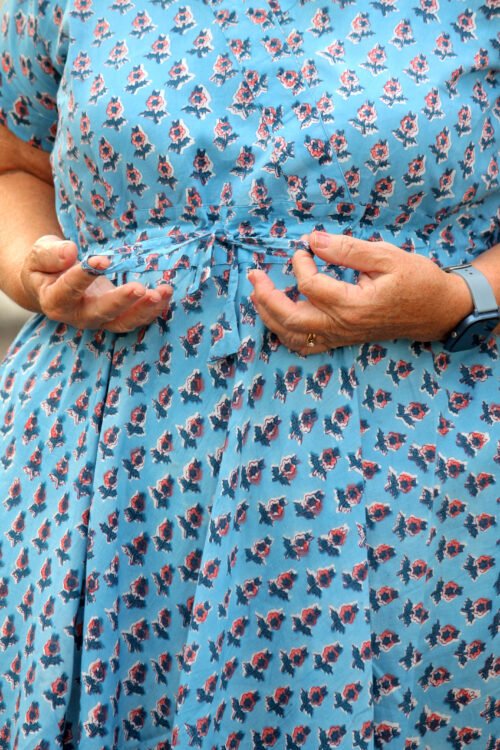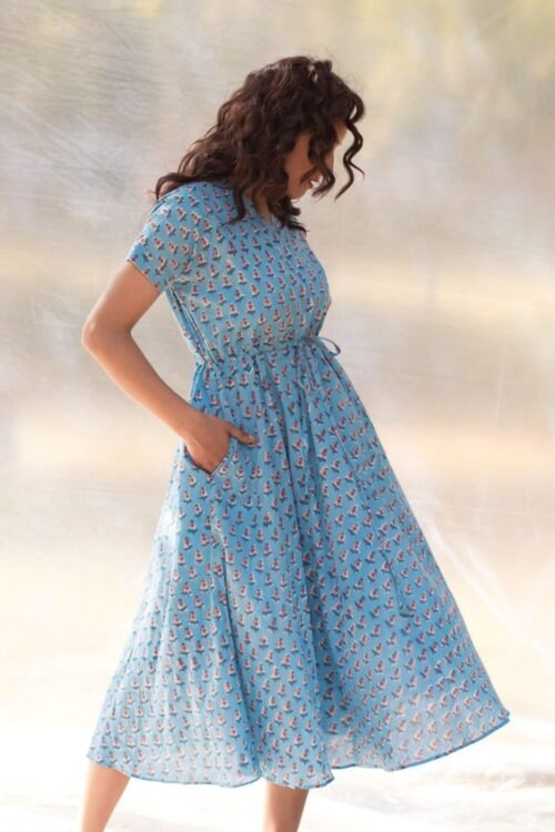 The Sweet Lily Crossover Tie Up Dress blends artisanal charm with modern comfort. Crafted from soft cotton and hand block printed with a delicate lily pattern, its crossover neckline and tie-up waist create a flattering fit for effortless everyday style.